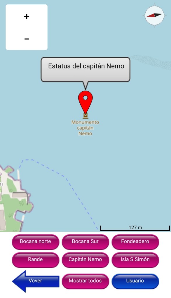 Premendo en cada botón, aparecerá sobre o mapa de Vigo un marcador coa localización correspondente. No botón Usuario, aparecerá a posición do propio usuario, se este ten o GPS activado. O botón Mostrar todos, mostra os marcadores de tódas as loca.lizacións. No botón Volver, vólvese ao menú principal.