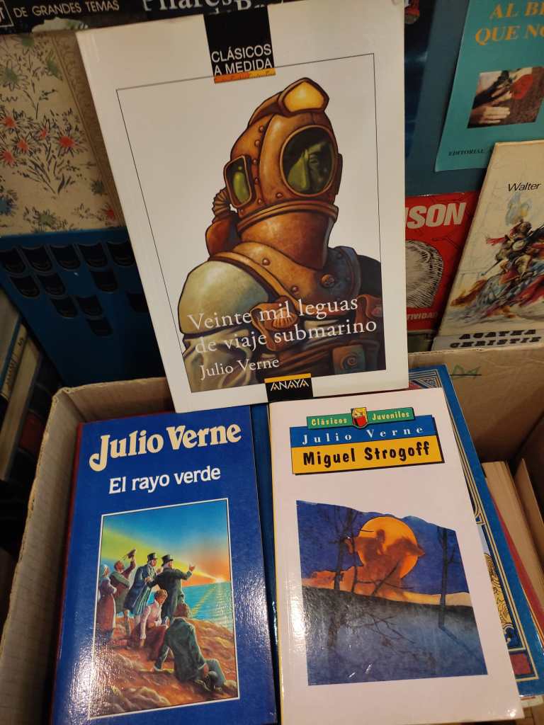 Durante estas semanas, seleccionaron centos de libros en diversas edicións das obras do autor de Nantes, que se poderán adquirir ao prezo de 1 euro, e entre as que se inclúen publicacións en castelán, galego e portugués, algunhas delas de coleccións inesquecibles como as de Bruguera, Molino ou Plaza y Janés. Moitos destes libros poden transportarnos ás lecturas da nosa infancia. Tamén hai libros en formato cómic ou ilustrados, xunto ás grandes coleccións que nas últimas décadas apareceron reunindo a obra verniana.