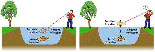 Recientemente se han desarrollado unos materiales exóticos que poseen propiedades ópticas que se creían imposibles. Se les ha dado en llamar «metamateriales». En ellos, el índice de refracción se comporta de forma extraña. La refracción es la desviación que experimenta la dirección de propagación de un rayo de luz cuando pasa de un material a otro. El índice de refracción nos da una cierta medida de la amplitud de esa desviación. Normalmente, el índice de refracción es constante si el material presenta propiedades constantes y, se creía, siempre positivo.